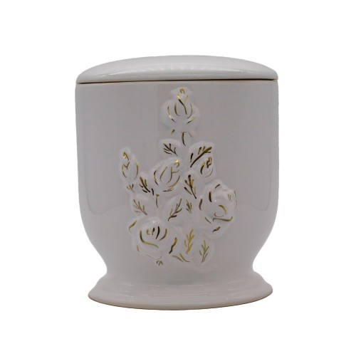 Aranyozott kerámia urna rózsacsokor mintával fehér színben.