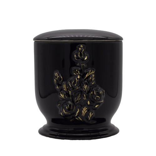 Aranyozott kerámia urna rózsacsokor mintával fekete színben.