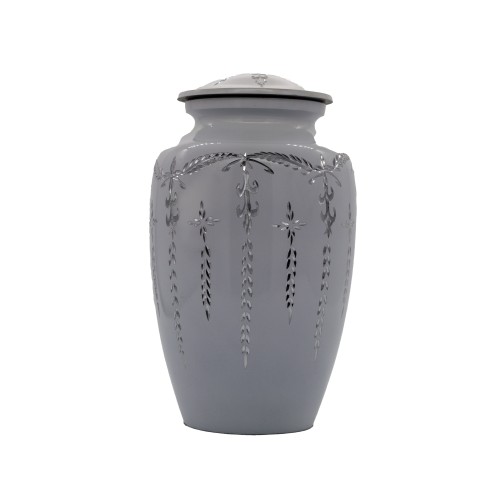Amerikai stílusú fém urna exkluzív kivitelben fehér színben gravírozott ezüst mintával.