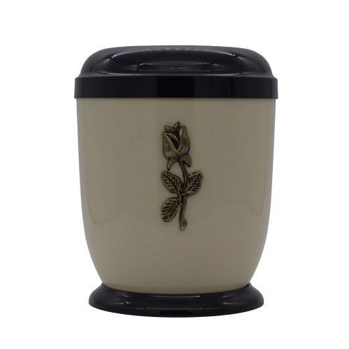 Fém urna talpas kivitelben bézs színben rózsa fémrátéttel.