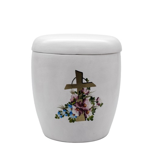 Kerámia urna matt felülettel kézzel festett kereszt mintával.