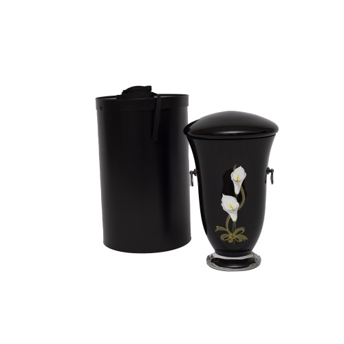 Üvegopál urna fekete színben kézzel festett két szál kála mintával fém keszonnal.