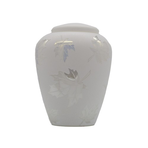 Exkluzív matt fehér üvegopál urna őszi falevél mintával.
