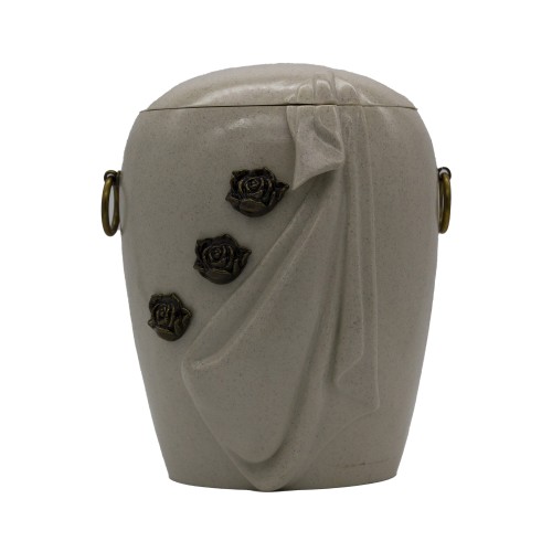 Urna kompozit anyagból, fehér márvány őrleménnyel dúsítva gyászfátyol formával rózsa fémrátéttel.