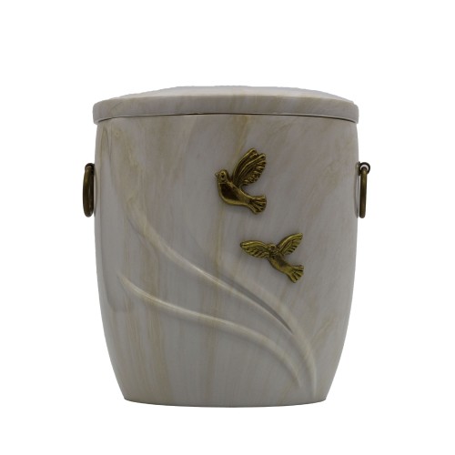 Urna kompozit anyagból, vanília színben ívelt formával angyal/galamb fémrátéttel.