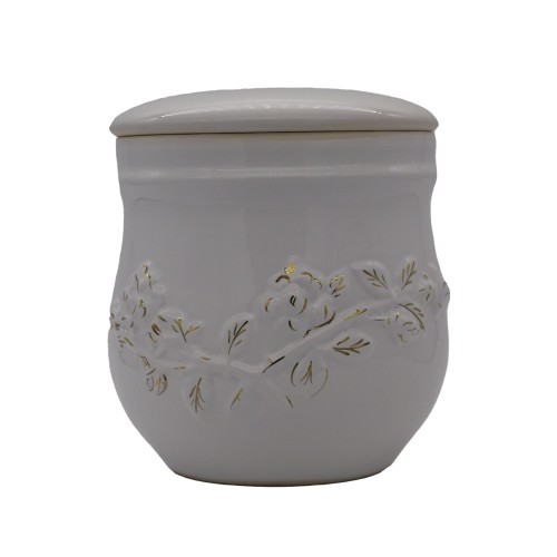 Aranyozott kerámia urna rózsaszál mintával fehér színben.
