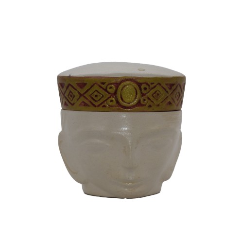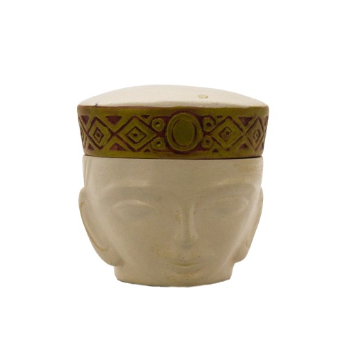 Kézzel készített mini urna férfi fej alakú Kákonyi Júlia keramikus művész műhelyéből hamvak otthoni tárolására.