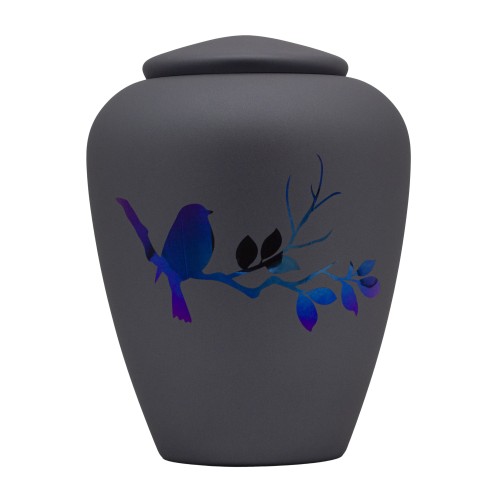 Exkluzív üvegopál urna kobaltkék énekesmadár mintával.