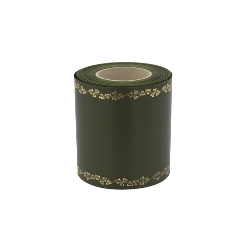 Nyomtatható szatén koszorúszalag arany mintával a szélein 10cm széles zöld színben. 25m hosszú tekercs.